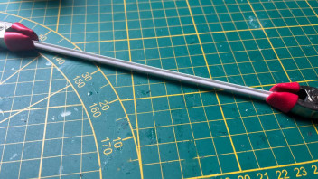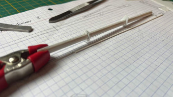 Ich fange mal fast ganz hinten mit dem Mixer an, dem letzten Teil, der auch in die Gülle getaucht wird. Der ist mehrfach verstärkt. Angefangen mit einer 5mm Poly Stange, oben einen Streifen "Längsverstrebung" aufgeklebt. Steht sogar erstaunlich gerade.