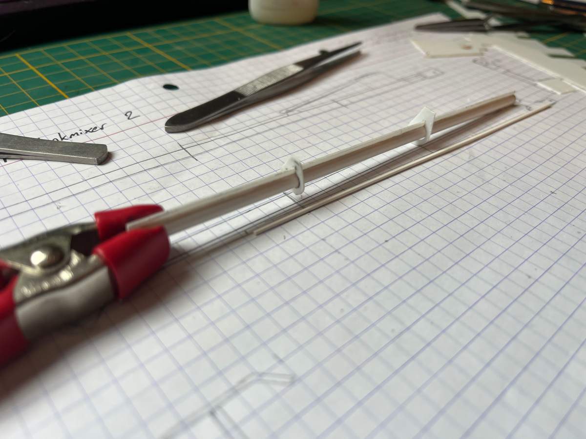 Ich fange mal fast ganz hinten mit dem Mixer an, dem letzten Teil, der auch in die Gülle getaucht wird. Der ist mehrfach verstärkt. Angefangen mit einer 5mm Poly Stange, oben einen Streifen "Längsverstrebung" aufgeklebt. Steht sogar erstaunlich gerade.