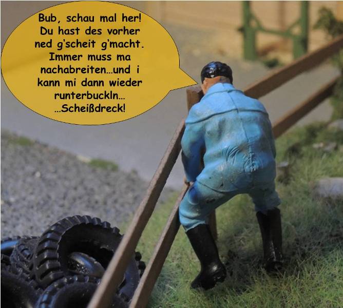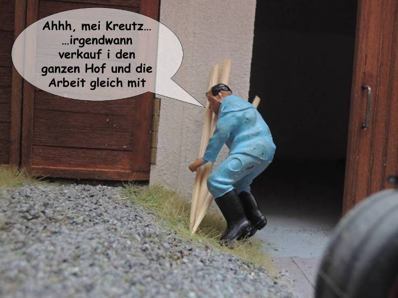 Nachdem Opa die Lust am nicht funktionierenden Gerät verloren hatte, begutachtete er mit geschultem Auge, welch groben Murks Sepp wieder veranstaltete. Sepp hörte Opas Genörgel aber gar nicht mehr, da er sich gleich nach Beendigung seiner Tätigkeit zurück zum Stall begab.