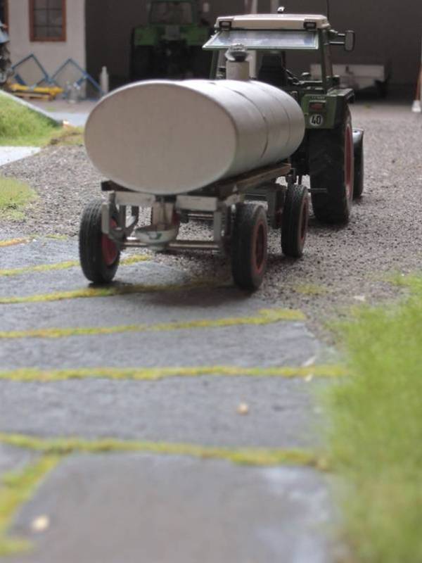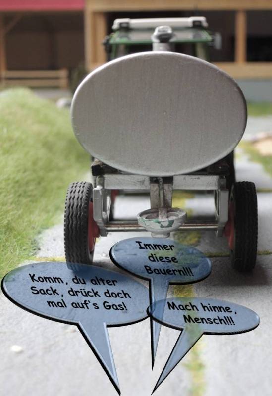 "Spezialisten" am WerkNach dem Mittagessen brach Opa mit dem Fendt auf, um das Wasserfass zu holen. Schön gemütlich fuhr er zurück zum Hof, so dass sich langsam eine Autoschlange hinter ihm bildete.