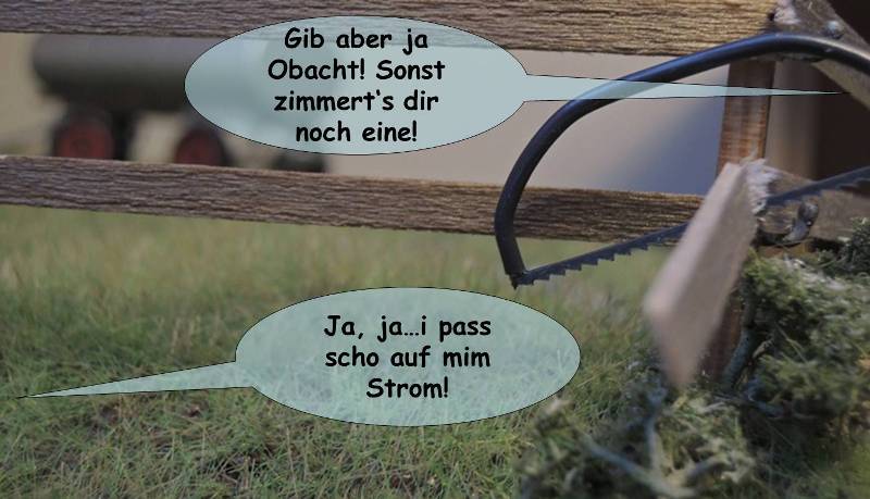 Sepp sägte inzwischen das zweite Brett ab, beäugte jedoch geichzeitig Opas Gefummel am Weidezaungerät.