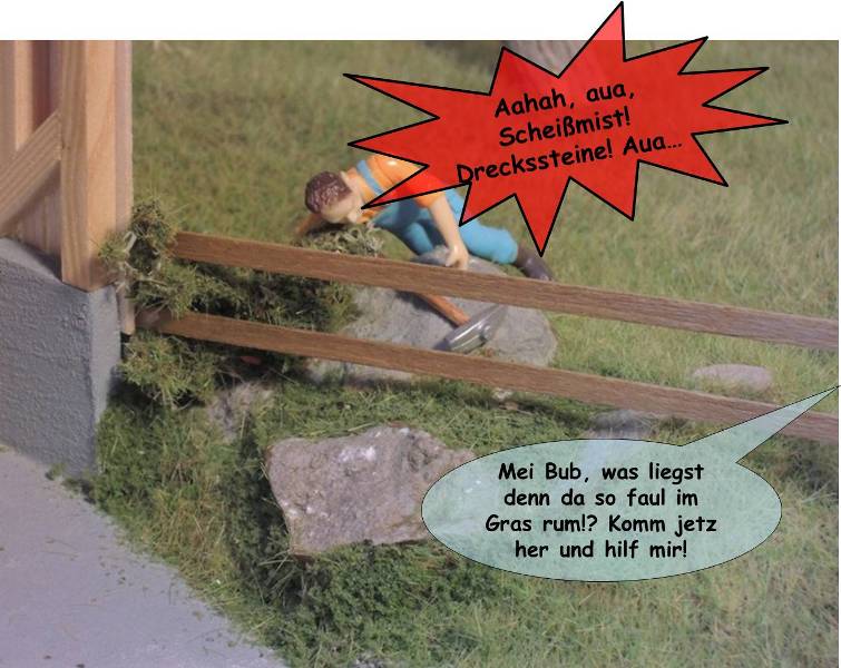 Nachdem Opa die Lust am nicht funktionierenden Gerät verloren hatte, begutachtete er mit geschultem Auge, welch groben Murks Sepp wieder veranstaltete. Sepp hörte Opas Genörgel aber gar nicht mehr, da er sich gleich nach Beendigung seiner Tätigkeit zurück zum Stall begab.