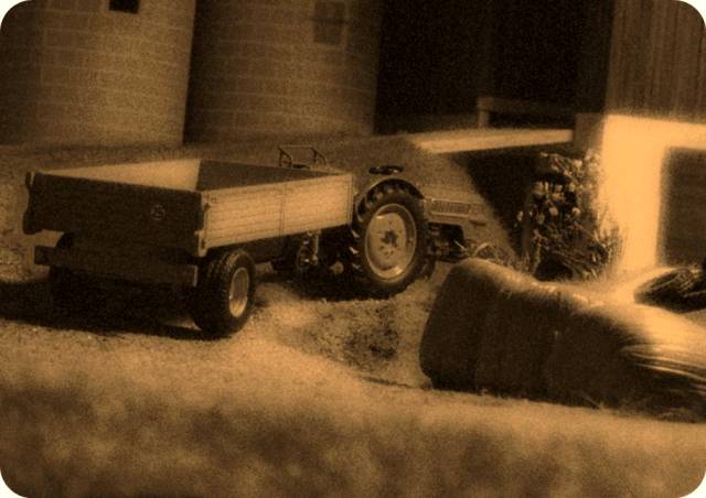 Dann kramte er seinen alten Fotoapparat hervor, den er stets in der Jackentaschen mitführte, und lichtete das Gespann ab. Natürlich hätte Opa das vermeintliche Hauptmotiv, nämlich den Fendt, von vorne und ohne landschaftsstörende Siloballen fotographieren sollen. Aber Opa war in dieser Hinsicht kein Profi und knipste Szenen "einfach so, wie sie daher kommen" - so auch diese: