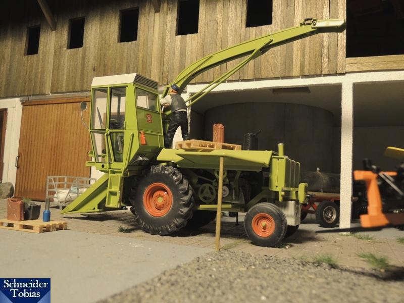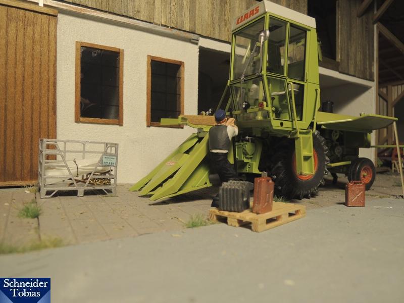 Opas Enkel Sepp hatte zwischenzeitlich passende Schrauben besorgt, so dass Opa seine Arbeit beenden konnte. Jetzt musste nur noch das Auswurfrohr zum Laufen gebracht werden - dann ist unser alter Claas fit für die Maisernte.