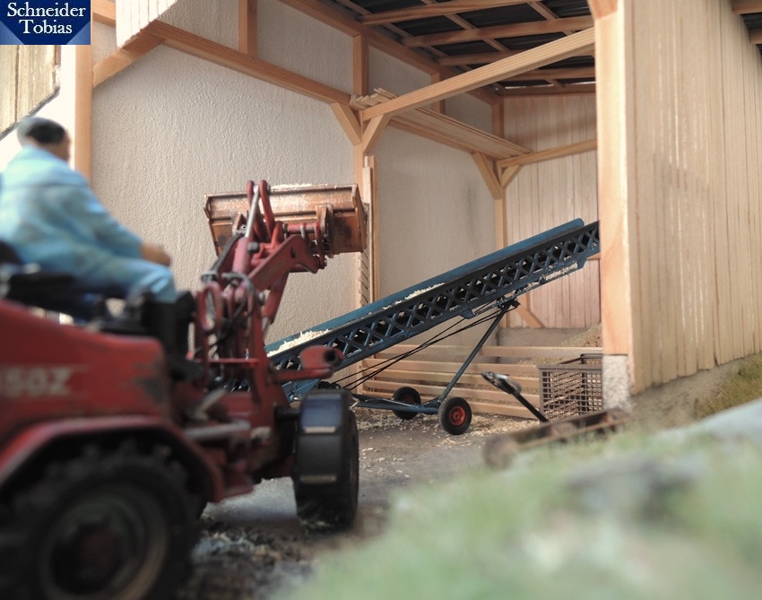Sepp bemühte sich, die beim Abladen vom Förderband gefallenen Hackschnitzel zusammenzuräumen.