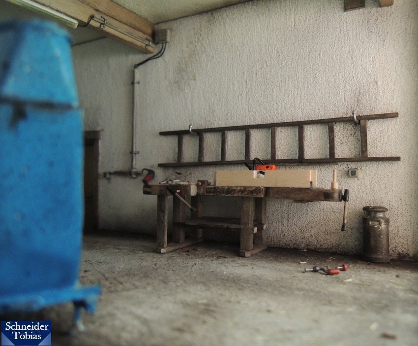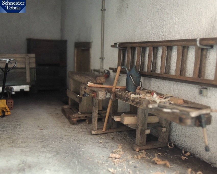 ... und machte sich auf die Suche nach einem passenden Stück Holz, aus dem er einen neuen Stiel schnitzen könnte. Allerdings wurde er in der Werkstatt nicht fündig.