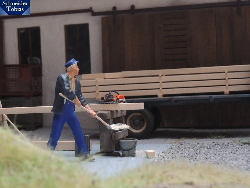 "Ach was, des passt dann schon so. Heb' du die beiden schon bezahlten Balken mit'm Sepp auf'n Anhänger.", antwortete Alfons, um potenzieller Kraftanstrengung auf jeden Fall aus dem Weg zu gehen. Opa und Sepp beluden also und Alfons rangierte den GT anschließend zur Deichsel des Anhängers. Sepp begann bereits mit den Aufräumarbeiten, während Opa zu Alfons trabte, der etwas unbeholfen am Stützrad herumdrehte.