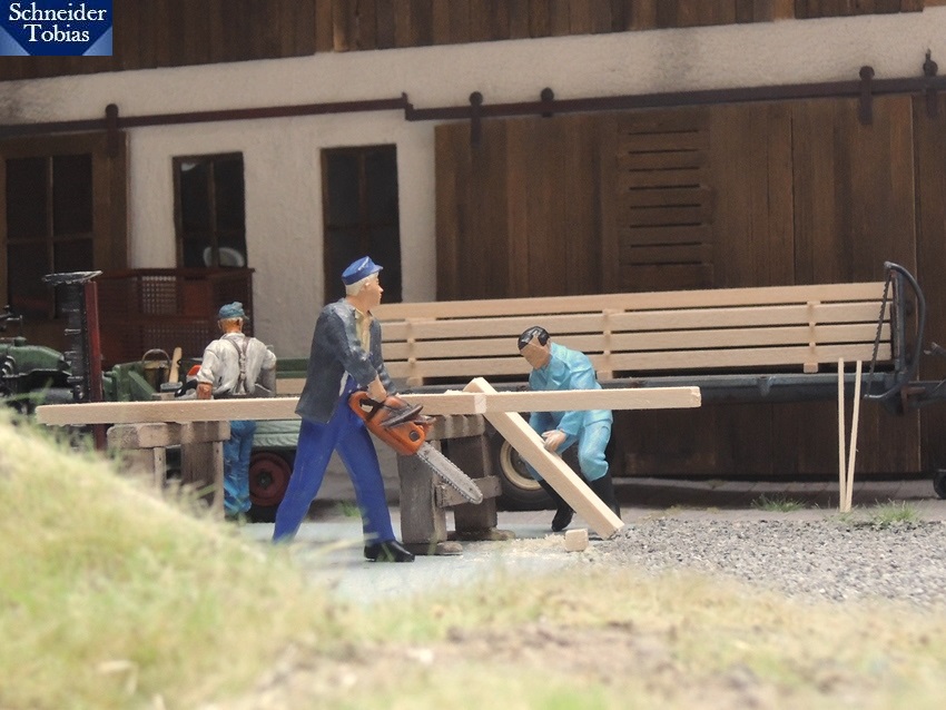 Eine halbe Stunde danach war man auf dem Schneider-Hof bereits fleißig zu Gange - zumindest 2/3 der Anwesenden. Zwei Balken hatten sie schon auf Maß gebracht und nun musste der dritte zum Abschneiden vom Anhänger gehoben werden. "Passt bloß auf, dass euch der Balken ned runterfällt. Des Bauholz war sauteuer!", gab Alfons zu verstehen, der Opa und Sepp beim Abladen kritisch zuschaute. "Vielleicht bequemst du dich mal her, Faulhaber, und packst mit an!?!", sprach Opa zu Alfons, während er und Sepp mit vereinten Kräften den Balken anhoben.