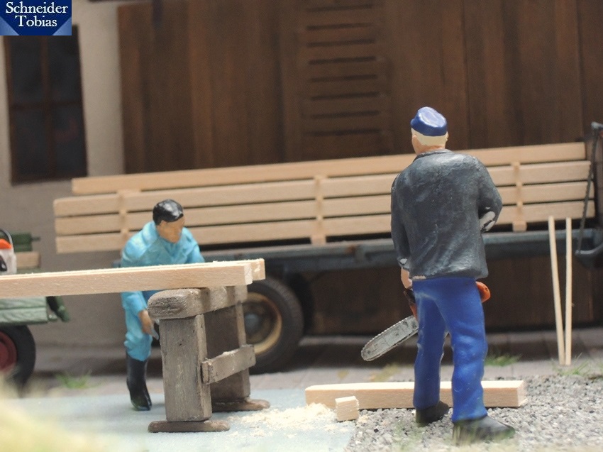 Nachdem Opa und sein Enkel einige der Balken auf die Holzböcke gelegt hatten, übergab ihnen Alfons wieder einen Zettel mit verschiedenen Maßen. "Aber Alfons, die Maße sind schon bissl komi...", wollte Sepp seine Bedenken wegen der komischen Maßangaben kundtun. Aber Opa unterbrach ihn sogleich: "Ja, ja, des können wir schon so machen. Gell Sepp, des wolltest du doch sagen! Der Kundenwunsch hat für uns immer höchste Priorität und alles wird so g'macht, wie's der Kunde will." Selbstverständlich wunderte sich auch Opa über die seltsamen Maße, aber er bedachte, dass er schon kassiert hatte und jedes Nachfragen nur unbezahlter Zusatzaufwand wäre. Er sprang daher flink vom Anhänger, markierte schnell und grob die Balken und gab Sepp freie Fahrt zum Starten der Kettensäge.