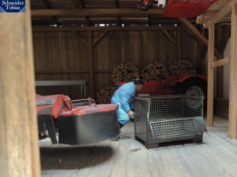 Nachdem er am Baum vorbeigezirkelt war, fuhr er rückwärts hoch in den ersten Stock, wo er das Mähwerk einwintern wollte. Er stieg vom Traktor ab und räumte eine passende Fläche frei. Schließlich schob er noch die Gitterbox unter das Kranpodest und konnte dann seine Arbeit fortsetzen.