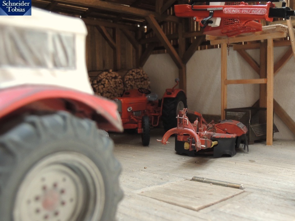 Wahrenddessen fuhr Sepp den großen Deutz aus der Werkstatt. Er kuppelte den Oberlenker an, damit er den Mulcher, der noch neben dem Baum verweilte, von dort entfernen konnte.