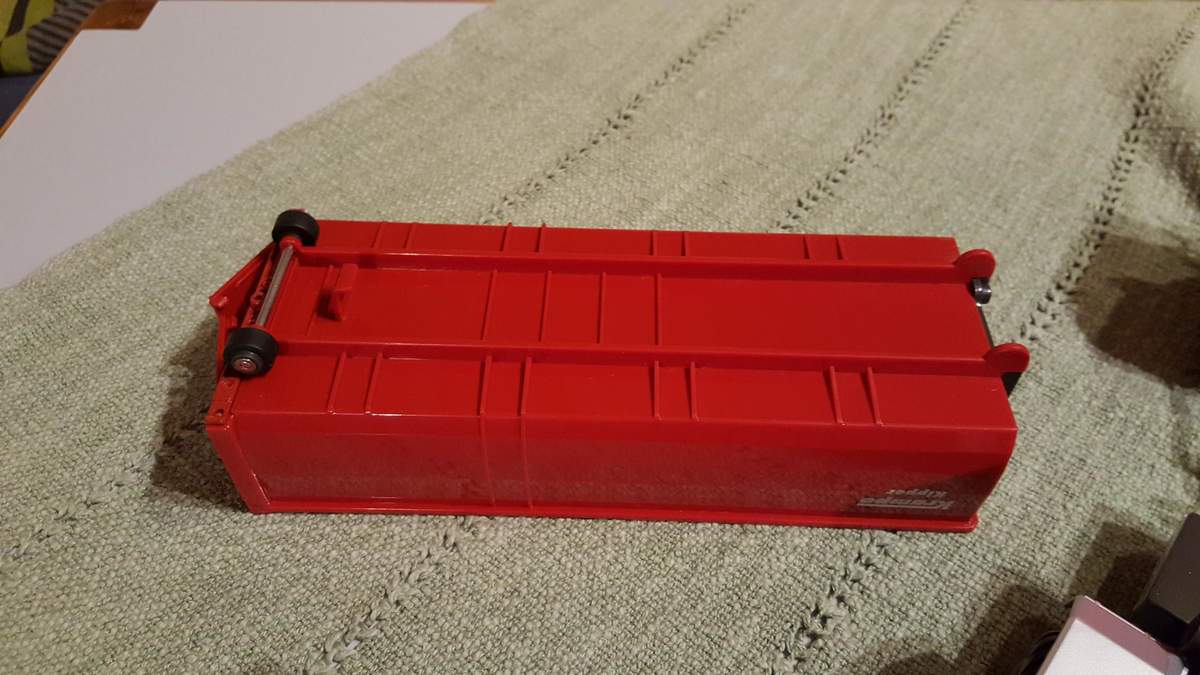 und an der Front der Mulde angeschraubt. Unter der Mulde befinden sich noch zwei Rollen und der oben schon erwähnte Haken.Ob die Mulde des Fortuna-Hakenlifters passt kann ich leider nicht Prüfen.