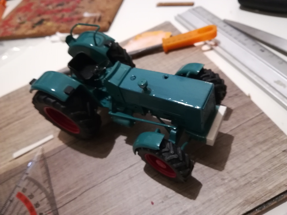Jetzt fehlen noch neue Aufkleber, die beim nächten Druck in Angriff nehmen werde. Außerdem überlege ich, die vorderen Kotflügel noch Mattschwarz zu lackieren, um Kunststoffkotflügel zu imitieren. Da bin ich mir aber noch etwas unschlüssig, da ich nicht weiß, ob es die auch schon original gab oder nur später gelegetlich durch diese ersetzt wurden.