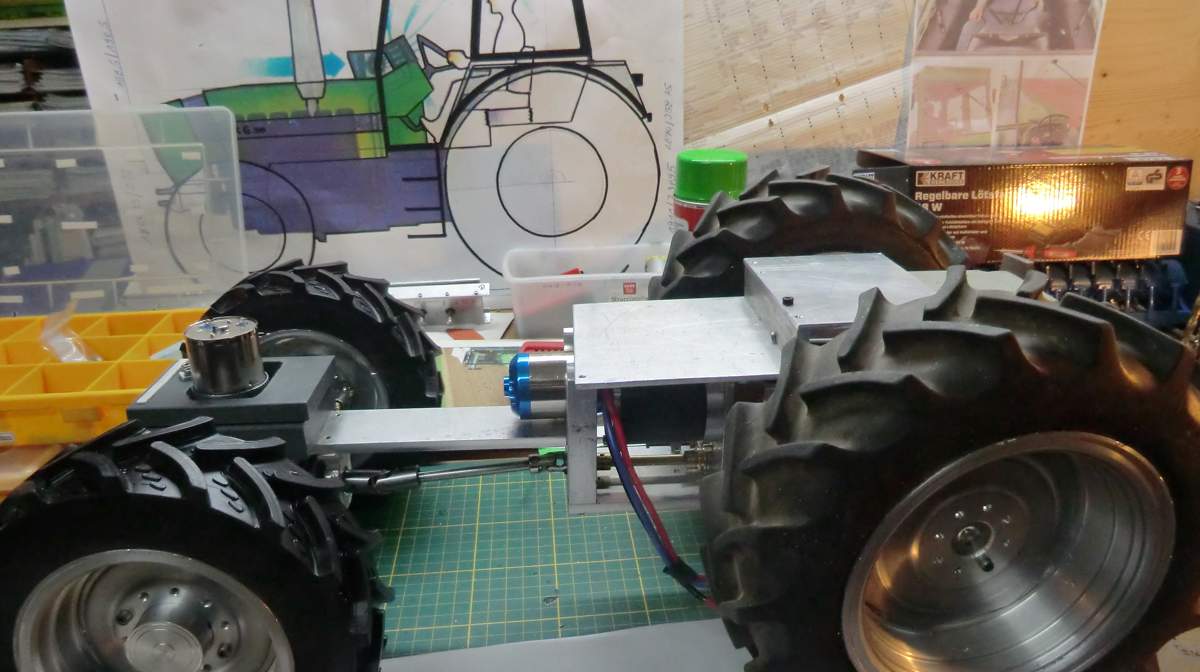 Vorne zur Lenkung ist noch ein sehr langsam laufender Getriebemotor eingebaut, mit sehr hohem Drehmoment.