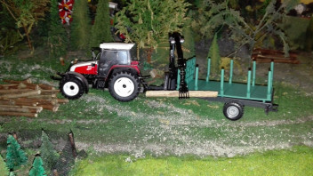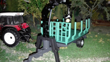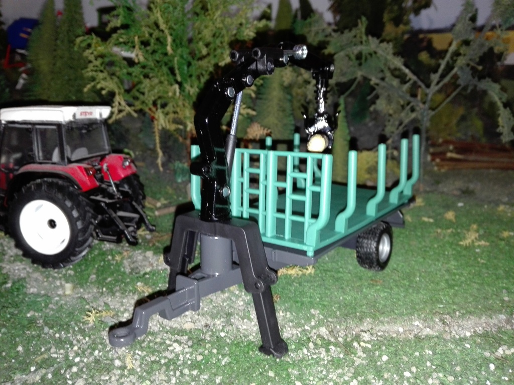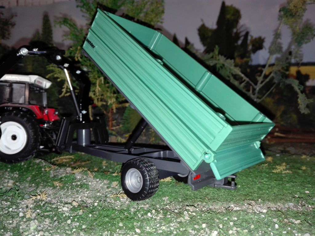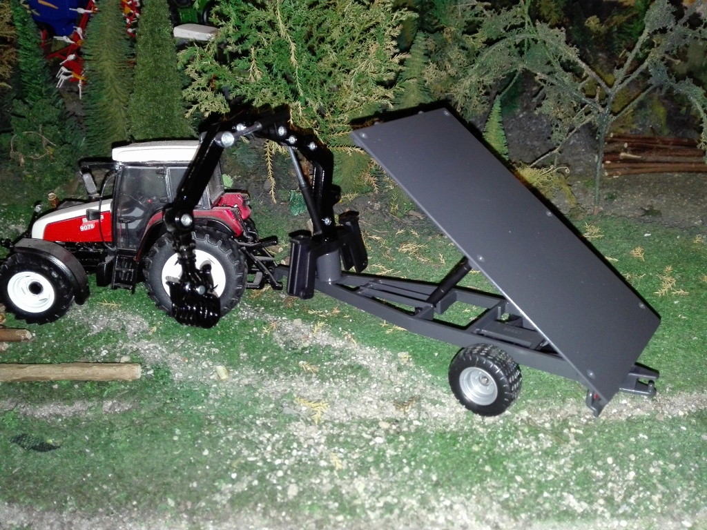 Ist ein tolles Modell geworden; sehr detailliert, aber bis auf den herausnehmbaren Bolzen der Anhängevorrichtung und die lenkbaren Räder leider ohne weitere Funktionen. Ich habe versucht, ihn zum Größenvergleich mit ein paar Anhänger und anderen Traktormodellen zu fotografieren. Irgendwie kommt mir das Modell dann etwas klein vor. Sieht aber trotzdem gut aus, finde ich: