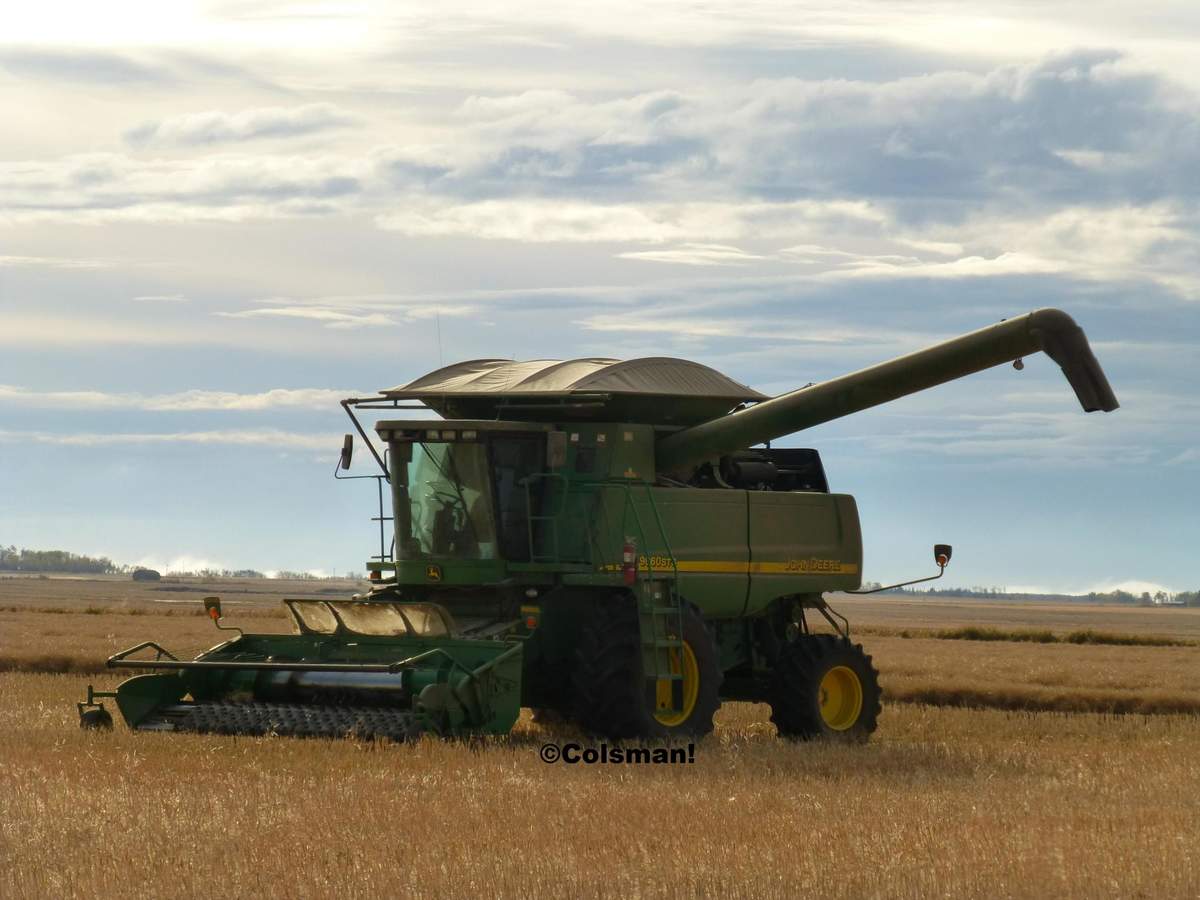 Ein paar Stunden später, wieder ein Bild aus der Drescherkabine, im Hintergrund das Tal des Peaceriver mit Zuflüssen