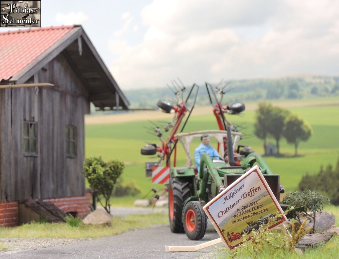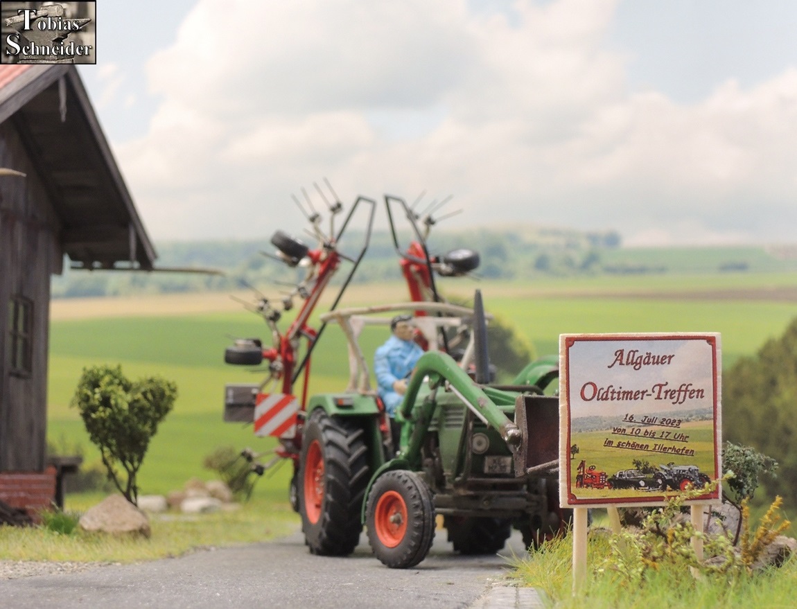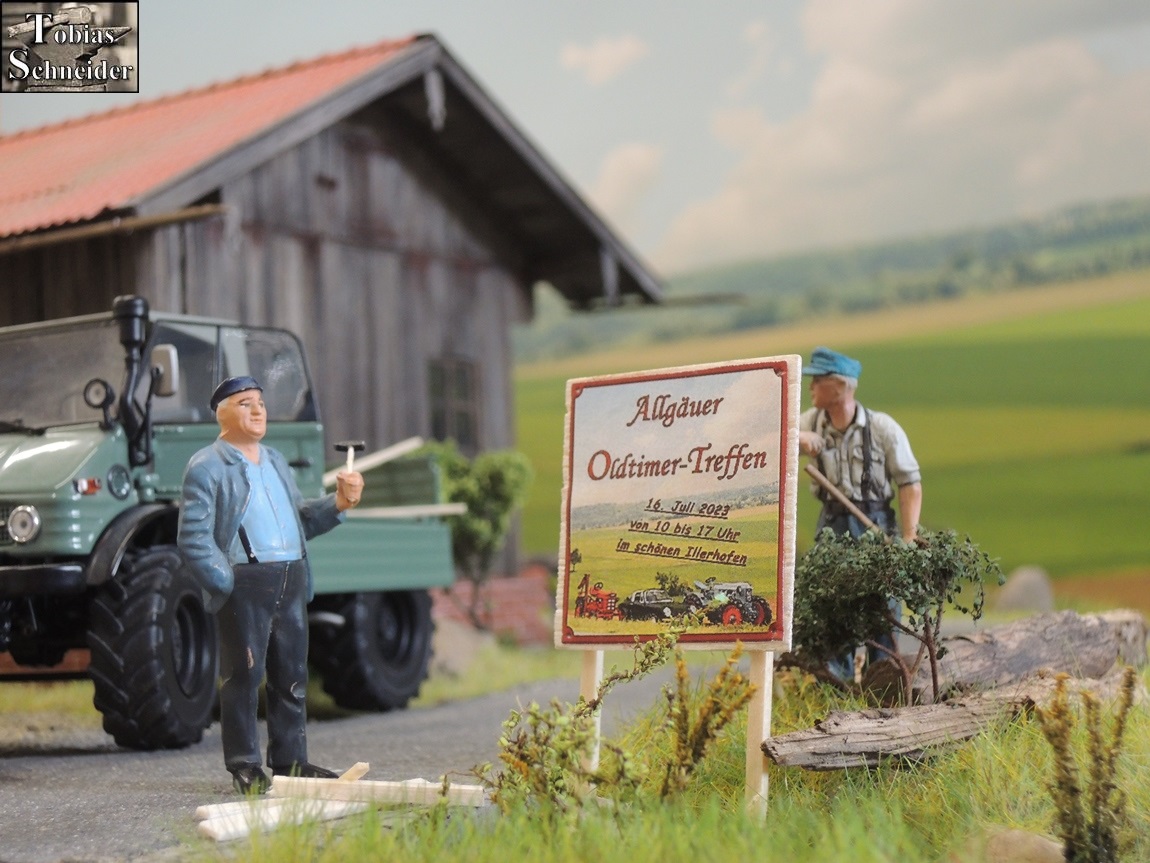 "Und von der Straße aus kann man's gut sehen," pflichtete ihm Faulhaber bei. Beide, Faulhaber und Herbert, waren im Oldtimer-Verein der Nachbargemeinde und machten sich heute daran, für das bevorstehende Treffen die Werbeplakate und -tafeln aufzustellen. "Auf geht's, Faulhaber, wir haben noch zwei Tafel zum Aufstellen und bald is Mittag", meinte Herbert zu seinem Kollegen und die beiden Oldtimer-Freunde begaben sich wieder mit dem Unimog auf den Weg zum nächsten Standort.
