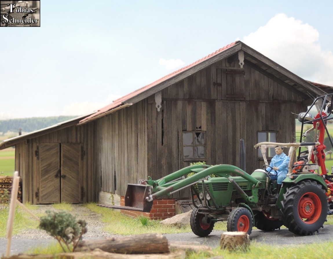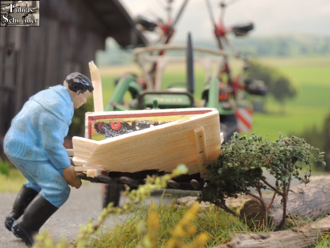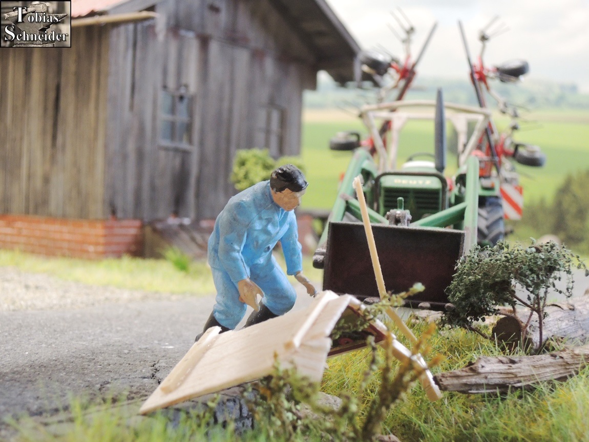 Langsam erlangte Opa wieder Sinn und Verstand über seine Gefühle. Jetzt musste es sehr schnell gehen. Er schaute links und rechts - keiner zu sehen. Flink kratzte der alte Landwirt sämtliche Holzteile aus dem Gras und zog die geschundene Tafel von der Fahrbahn; dann drückte er alles auf die Frontladergabel.