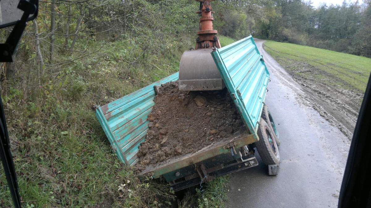 Dan rausziehen. Schlecht zu erkennen ist das der Wagen an einem Schlumpf am Baggerarm angebunden ist um in anzuheben und rauszuziehen mit dem Drahtseil am Unterwagen. Der Wagen hat kein Schaden genommen obwohl der Kippzylinder schon aufsaß
