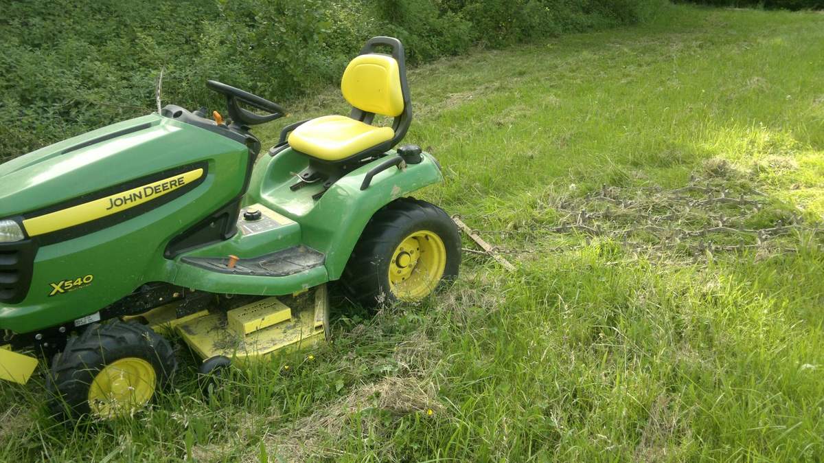 Hier beim mähen, der Schlepper hat ein Mulchmähwerk von Feucht Obsttechnik