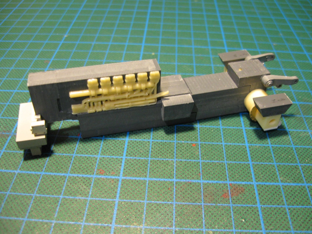 Das Fahrgestell ist mehrteilig und besteht aus Hart-PVC. Vorne bereits befestigt ist der Frontabschluss mit dem Zugmaul, Hinten sind bereits Teile des Krafthebers montiert, sowie gegossene Achstrichter mit Teilen der Kabinenbefestigung. Für sichtbare Details am Motor habe ich mich zu einer kleinen "Kopierrunde" entschieden und die Seiten des Schuco-Modells abgegossen. Was sich einfach anhört, ist in der realen Umsetzung etwas aufwändiger, da man hier die Form zum abgießen um das Schuco-Fahrgestell herumbauen muss... Letztlich ist es soweit geglückt, dass ich den oberen Teil mit Zylinderköpfen und Leitungen, sowie auf der gegenüberliegenden Seite, die charakteristische Lüfterreihe als jeweils ein komplettes Teil abgießen konnte.
