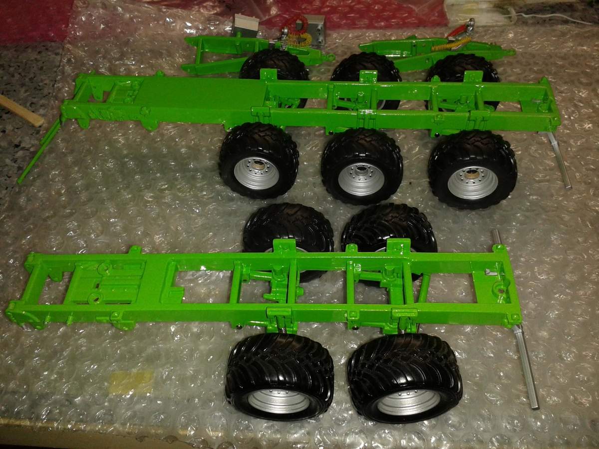 Also noch mal ran und Bilder anschauen, vergleichen und im Netz recherchieren. Dann wurde mir klar, dass der Abstand zwischen den Achsen des Achsaggregats vom ROS-Modell maßlich keineswegs mit dem Original-Tandem übereinstimmt. Da ich es genau wissen wollte, bin ich noch zu einem LU in der Nähe, hab mal gemessen und dabei eine Differenz von 8 mm (beim Modell) festgestellt.:( Das sollte so natürlich nicht bleiben.