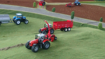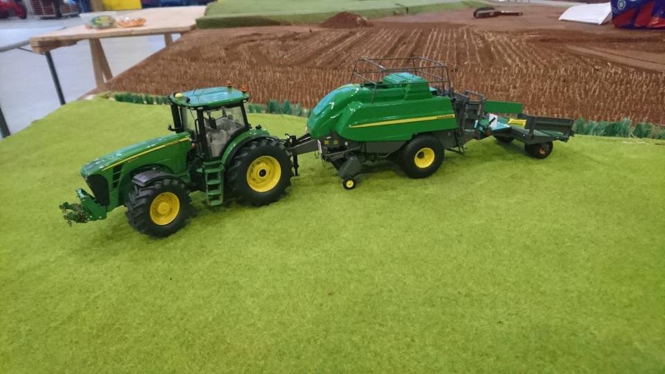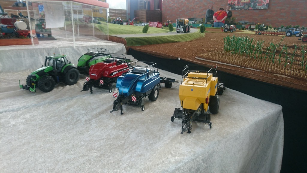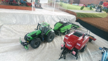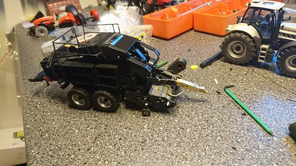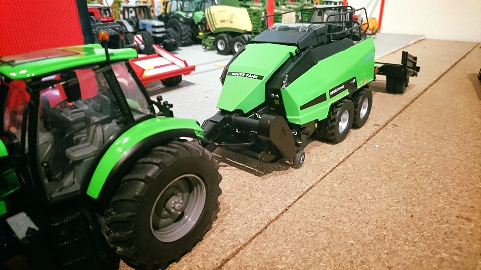 Einer umbauten Kuhn presse im Deutz farben mit 3D druckt vorbauhäcksler und 3D POMI ballenwagen.Der zugtier ist eine halb-fertig 7230 TTV (SIKU haube auf UH 7250)