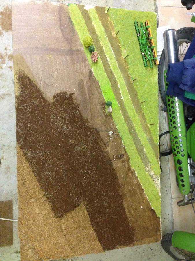 Bei der Darstellung von Erde würde ich keinen Kaffee, sondern direkt echte Erde nehmen (getrocknet, gesiebt). Diese wirkt - logischerweise - natürlich und lässt sich meiner Erfahrung nach auch super verarbeiten. Daneben frage ich mich, ob du die Platte noch erweiterst. Für einen Traktor vor dem bereits postierten Gerät ist ja etwas wenig Platz.Auf deine weiteren Fortschritte freue ich mich schon. Viel Spaß dabei!