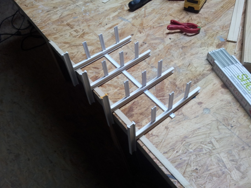 Hier möchte ich euch noch das parallel entstehende Schwerlastregal für die Lagerhalle des Hauptgebäudes zeigen. Eine Seite soll der Aufbewahrung von Bau-/Konstruktionsholz dienen, die andere ist zur Unterbringung von Stückgut oder Palettenware.