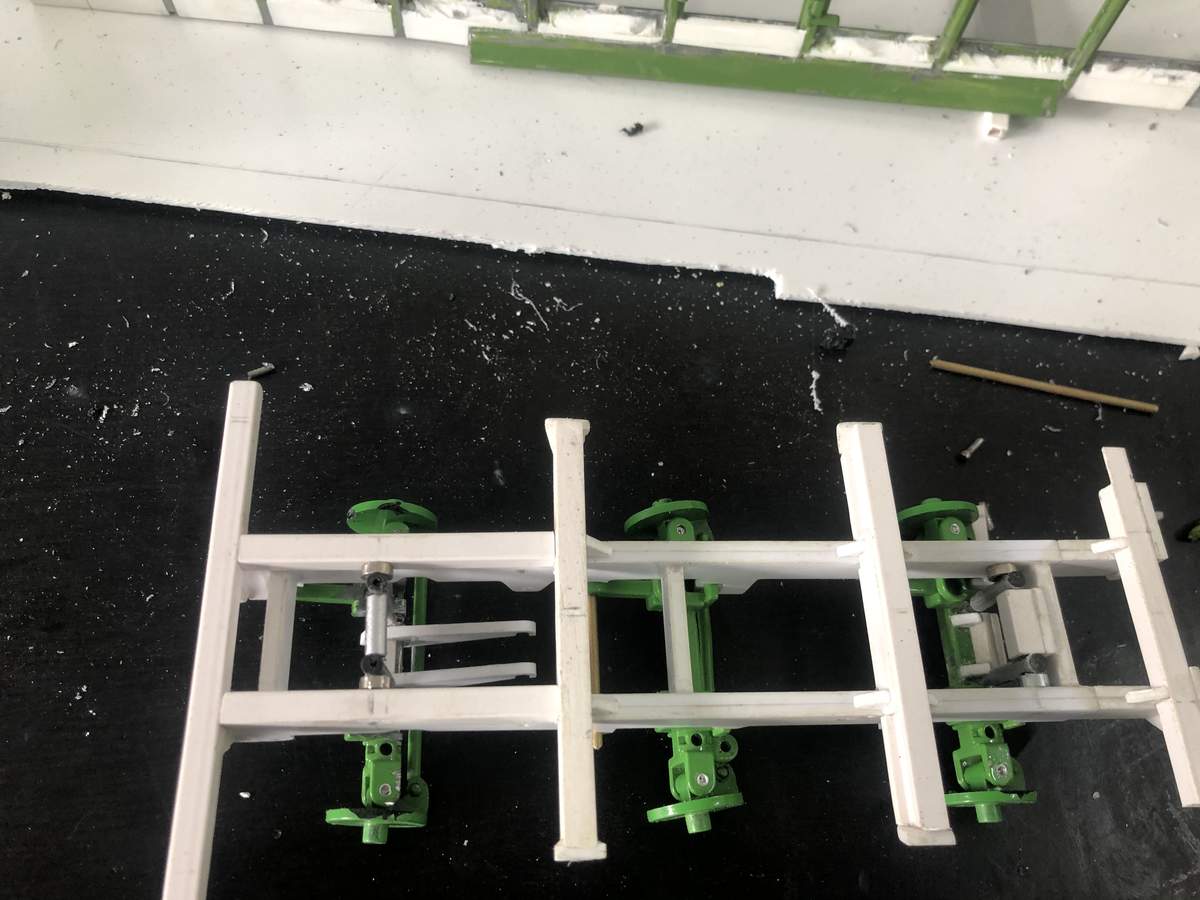 Dann fing ich mit dem Fahrwerk an , was natürlich in alle Richtungen Funktionieren musste , da ich die Keilform so klasse finde , wenn der wagen vorne abgesenkt wird , um das erntegut besser aufnehmen zu können .