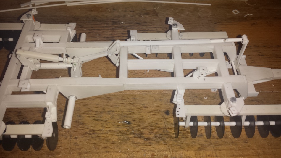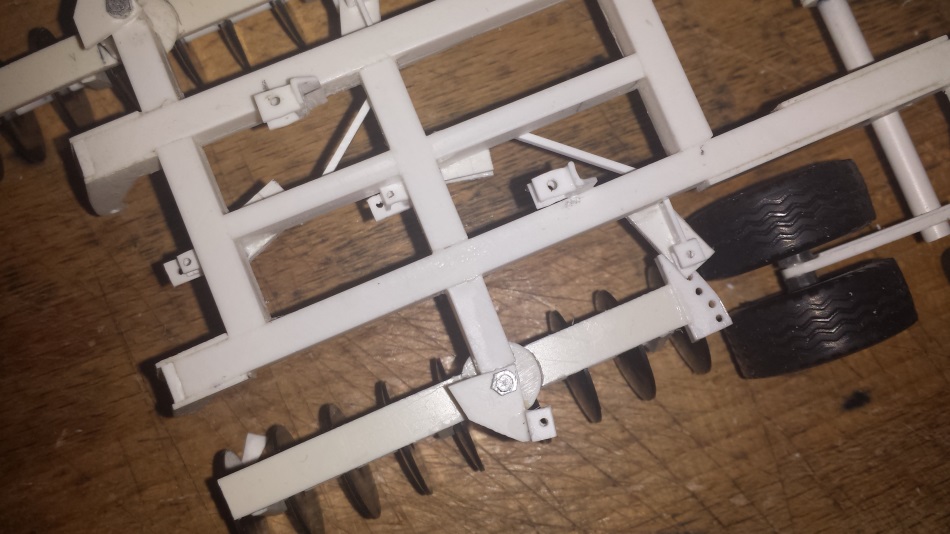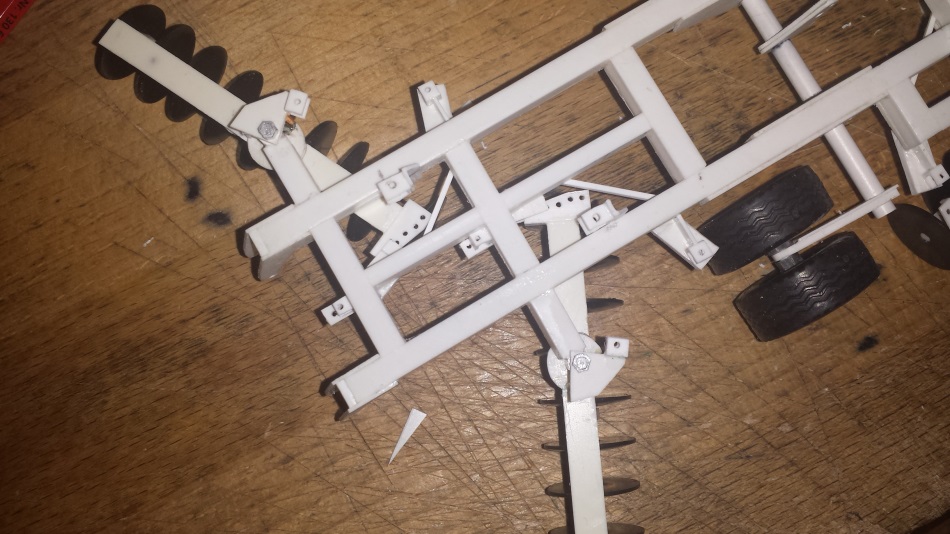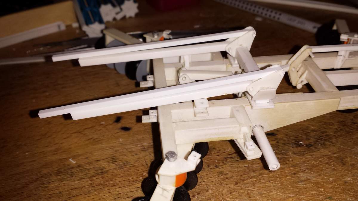 Gemacht wurde zuerst die Vorrichtung für den Anstellwinkel der Scheiben. Und dann wurde die Mechanik zwischen Fahrwerk und Deichsel noch