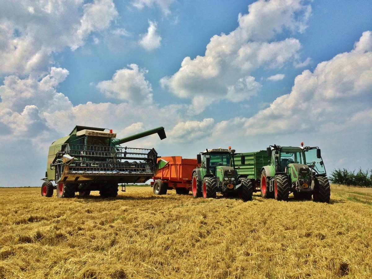 Noch schnell ein Bild, was am letzten Erntetag entstanden ist. Es zeigt die wichtigsten in der Ernte beteiligten Maschinen im Fuhrpark.