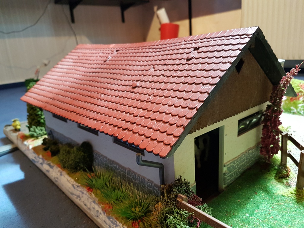 Der kuhstall ist von POLA LGB/G, Maßstab ist normalerweise 1/22,5... mußte die etwas "einbetonieren". Hat mir aber als solches gut gefallen, leider fehlt die Dachrinne...;)