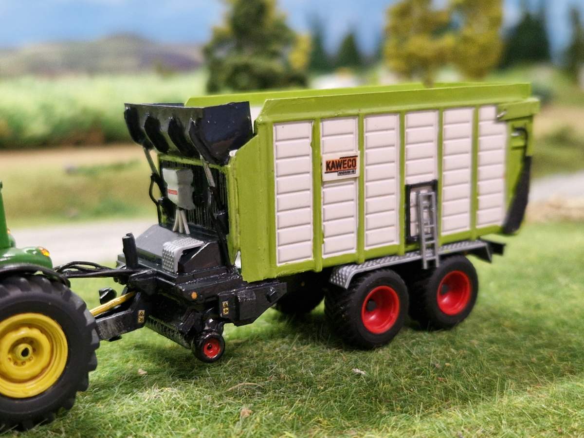 Abnehmbarer Korntank und Kibri Haspeln im Schneidwerk, der Tisch ist ebenfalls verlängert mit den Resten der Kibri Schneidwerke. Die weiße Kunststoff Verkleidung außen am Schneidwerk habe ich getrennt und wie im original verschoben.