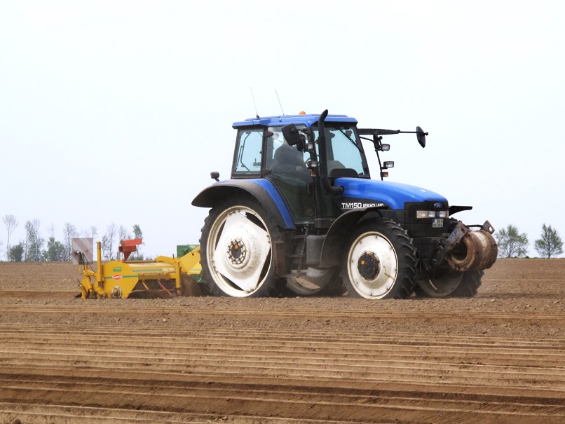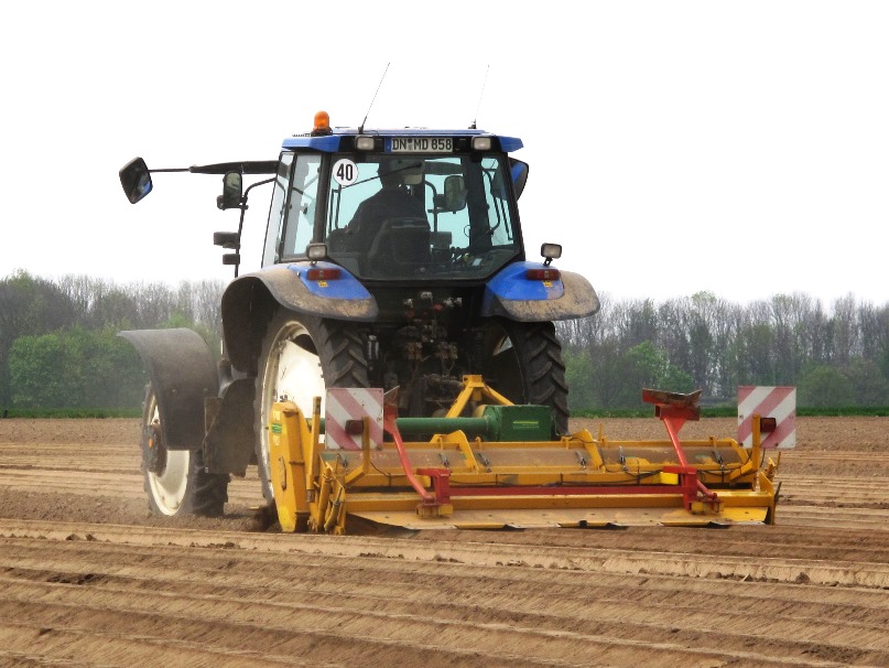 Und noch mal etwas Blaues: Ein Landini-Traktor in "High-Clearance"-Konfiguration für Spargelanbau - hier aber beim Rübensäen Ende März im Kreis Viersen: