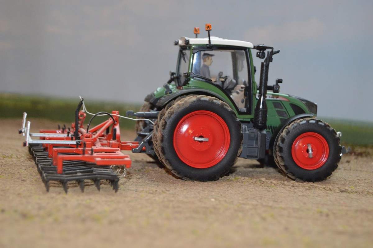 Wenn zwei gleich breite Zwillingsreifen die zulässige Höchstbreite für öffentliche Straßen überschreiten, setzen viele Landwirte zusätzlich zur Standarfbereifung ihres Schleppers vorhandene Pflegebreifung ein, um den Bodendruck zu vermindern. Erstmals gibt es eine solche Radkonfiguration auch als Modell im Maßstab 1:32: In Zusammenarbeit mit dem Modellhersteller Universal Hobbies (UH) hat Fendt sein Flaggschiff aus der 500-er Baureihe als auf 1.000 Stück limitiertes Sondermodell herausgebracht. Der "kleine" Fendt 516 verfügt über detailgetreue Zwillingsbereifung vorne und hinten samt Nachbildung des Befestigungssystems sowie über eine Fahrerfigur in Fendt Arbeitskleidung. Einziges Manko: Die Zwillingsbereifung ist beim Modell fest montiert und lässt sich nicht ohne weiteres Abnehmen. Eine solche Funktionalität wäre bei dem ansonsten (bis auf die UH-typische "Spielzeug"-Heckhydraulik) perfekten Modell der "Clou" gewesen. Insgesamt gefällt mir die Miniatur dennoch sehr gut.P.S.: Der auf einigen Bildern etwas herabhängende Seitenspiegel ließ sich - nachdem sich es erst auf den Fotos bemerkt hatte - problemlos zurechtrücken.