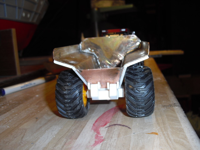 Die Mulde habe ich aus Kupfer gebaut,dasFahrgestell aus Poly-Profilen,die Reifen sind von Ros.