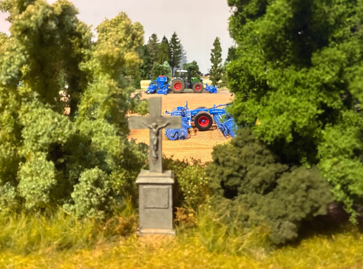 Heute habe ich ein Wegkreuz installiert. Im Hintergrund ackert der unbeliebte Wiling Fendt 728.