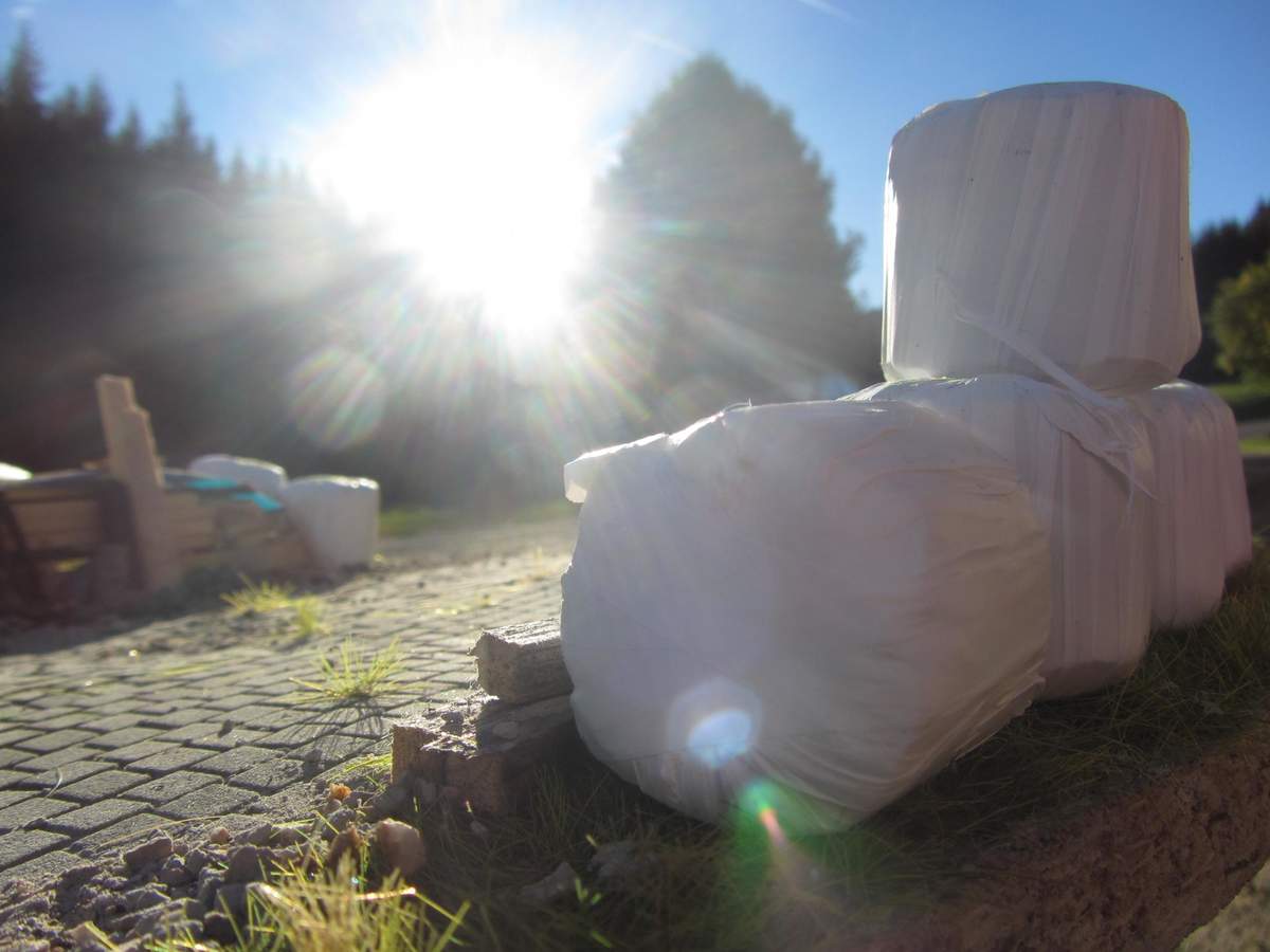 So das ist mein erster versuch von Siloballen. Ich weiß sie sind noch ziemlich eckig aber die nächsten was ich mache runde ich mehr ab oder versuchte das ich einen runden Schaumstoff bekomme mal sehn. Trotzdem gefallen sie mir sehr. Und Toto sie sehen mit Teflonband auch gut aus. ;):D:D