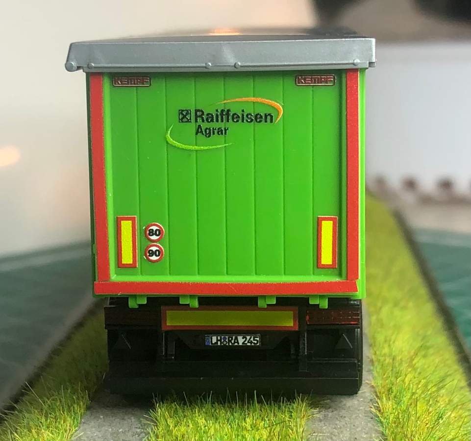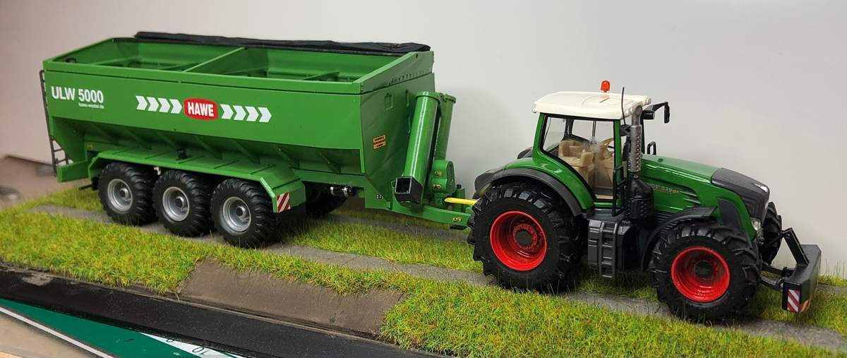 1x Fendt 926 mit Raiffeisen Mulde. Zum Modell -> umgebauter Wiking Fendt 930 mit der Haube von Trino und einigen hinzugefügten Details (Fahrer / Handgriffkabine / Rundumleuchte etc.....) . Die Mulde ist die Kempf von Herpa mit selbstgezeichneten Decals von mir.
