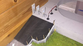 Die Rampe ist aus Laubsäge Holz. Die ganze Stein Optik ist mit Styropor Vorlagen gemacht (die haben 7€ gekostet). Die Drehkreuze sind aus Karton und Zahnstocher, genau so wie die Absperrung.