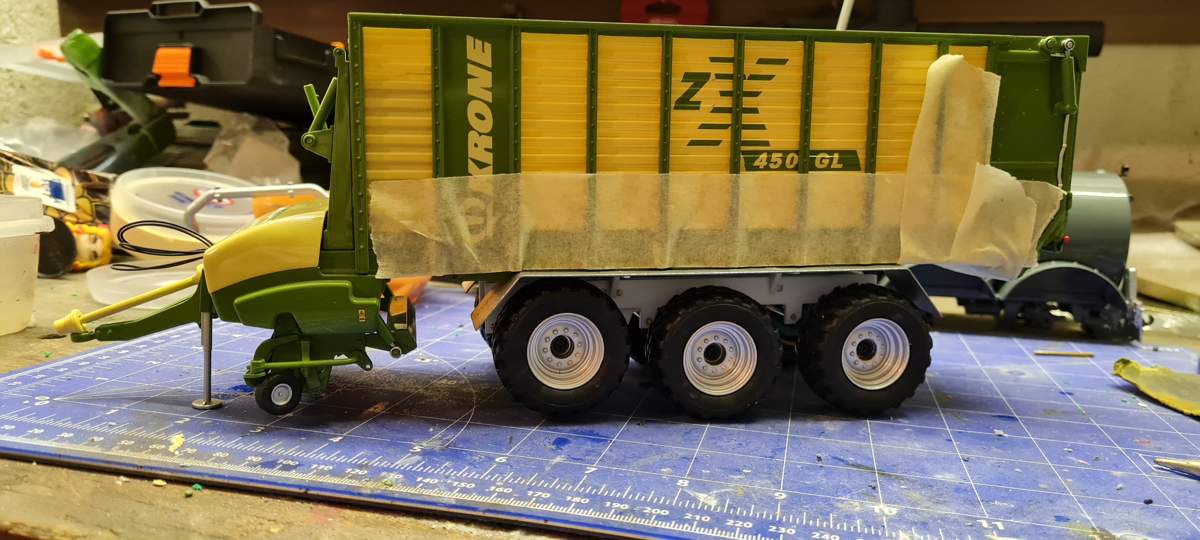 Hallo an alle, ich bin neu hier und auch im 1:32 Modellbau. Modellbau für und an sich ist nichts neues für mich. Zum Anfang hab ich mir ein Umbau des wiking Krone 450gl zum Tridem vorgenommen. Der Anfang ist gemacht nur momentan steh ich etwas am Schlauch wie der Rahmen samt Achsen unter dem Ladewagen befestigt werden soll. Vielleicht hat da ja schon mal jemand Erfahrung damit gemacht und kann mir ein paar Tipps oder sogar Bilder zeigen.? Würde mich sehr freuen. Wie bekommt man die Felgen von der Achse? Sind die geschraubt oder gesteckt? Hier nun mal zu dem ersten Bild