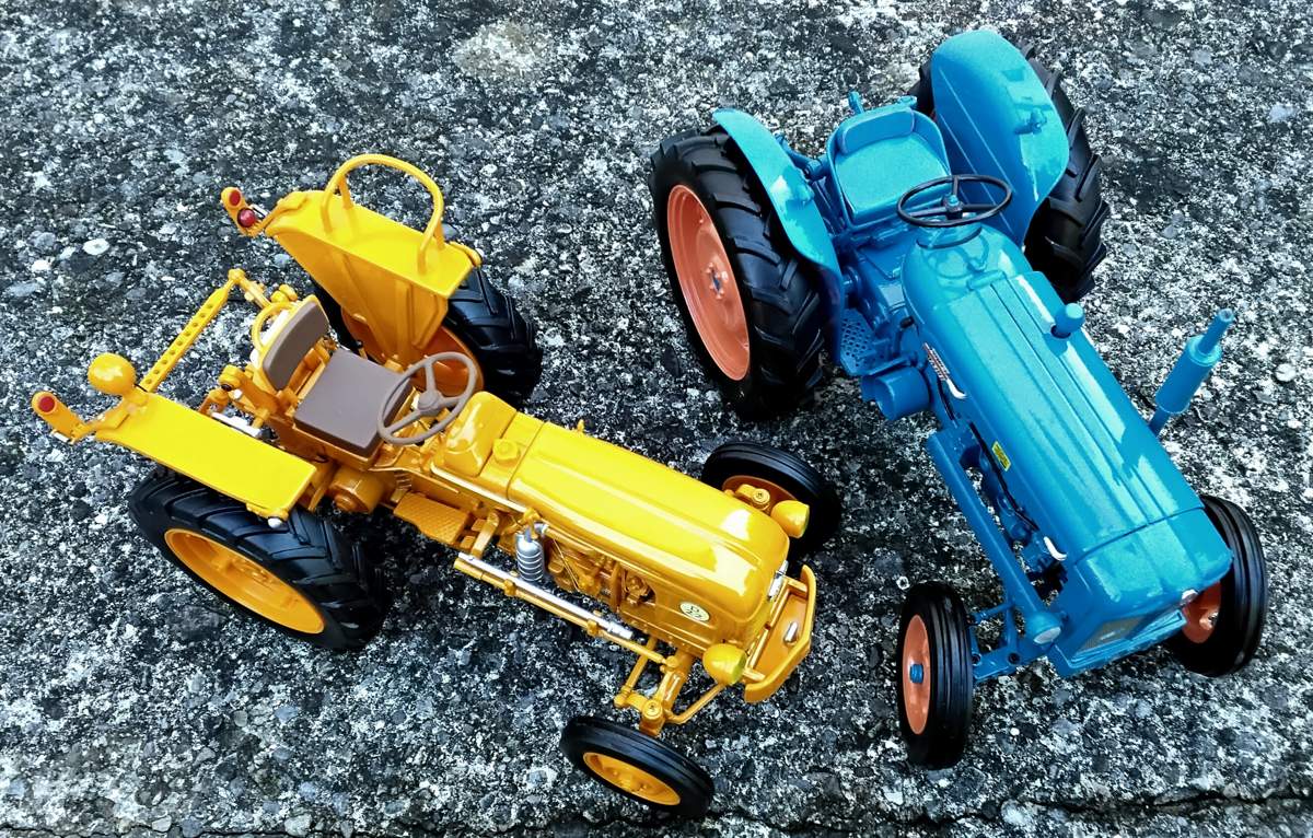 Die beiden hier gezeigten Traktoren habe ich in meiner Kindheit zwar nicht bewußt wahrgenommen - dies traf mehr auf Fendt und John Deere, aber auch auf Deutz und Eicher, Hanomag und MAN zu. Grüner Lack und grüne Kennzeichen, aber auch Rot-Weiß (wobei ich nicht sagen kann, ob McCormick oder Massey-Ferguson) habe ich da im Kopf, aber blauer Fordson und oranger Renault ? Die gab es bestimmt auch irgendwo zwischen Landshut und Ulm, zwischen Bad Aibling und Bad Tölz, waren aber doch eher selten. Trotzdem fand ich nun erst mal das Universal-Hobbies-Modell des 1958 bis 1960 gebauten Fordson Power Major toll, und entdeckte dann den schon 2 Jahre zuvor und somit ab 1956 dann 4 Jahre lang gebauten Renault D22, ebenfalls von Universal Hobbies :