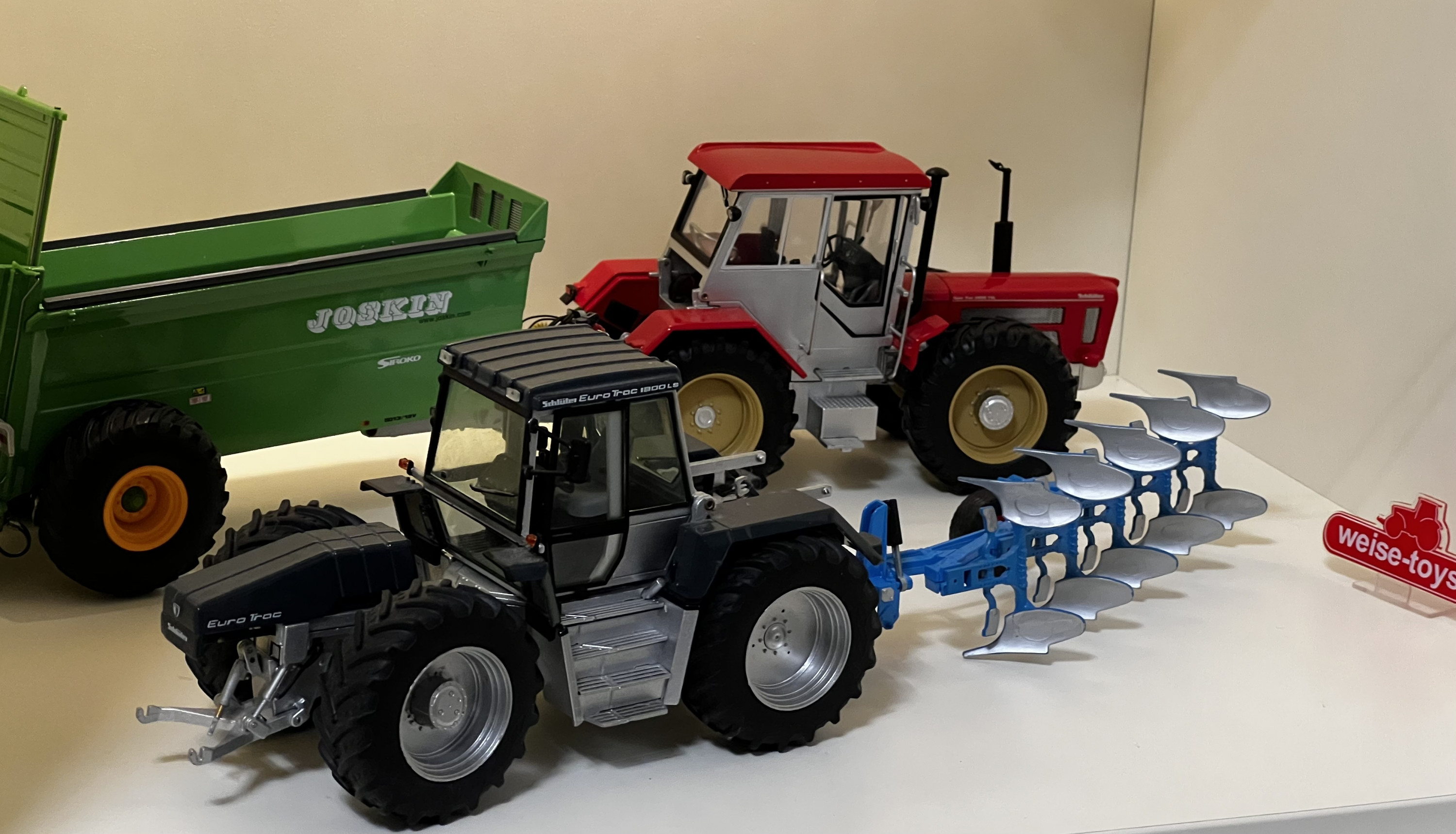 Hier sehen wir den Schlüter Supertrac 2000 beim Miststreuen mit einem Joskin Sirocco und den 1900er Eurotrac mit dem Pflug.