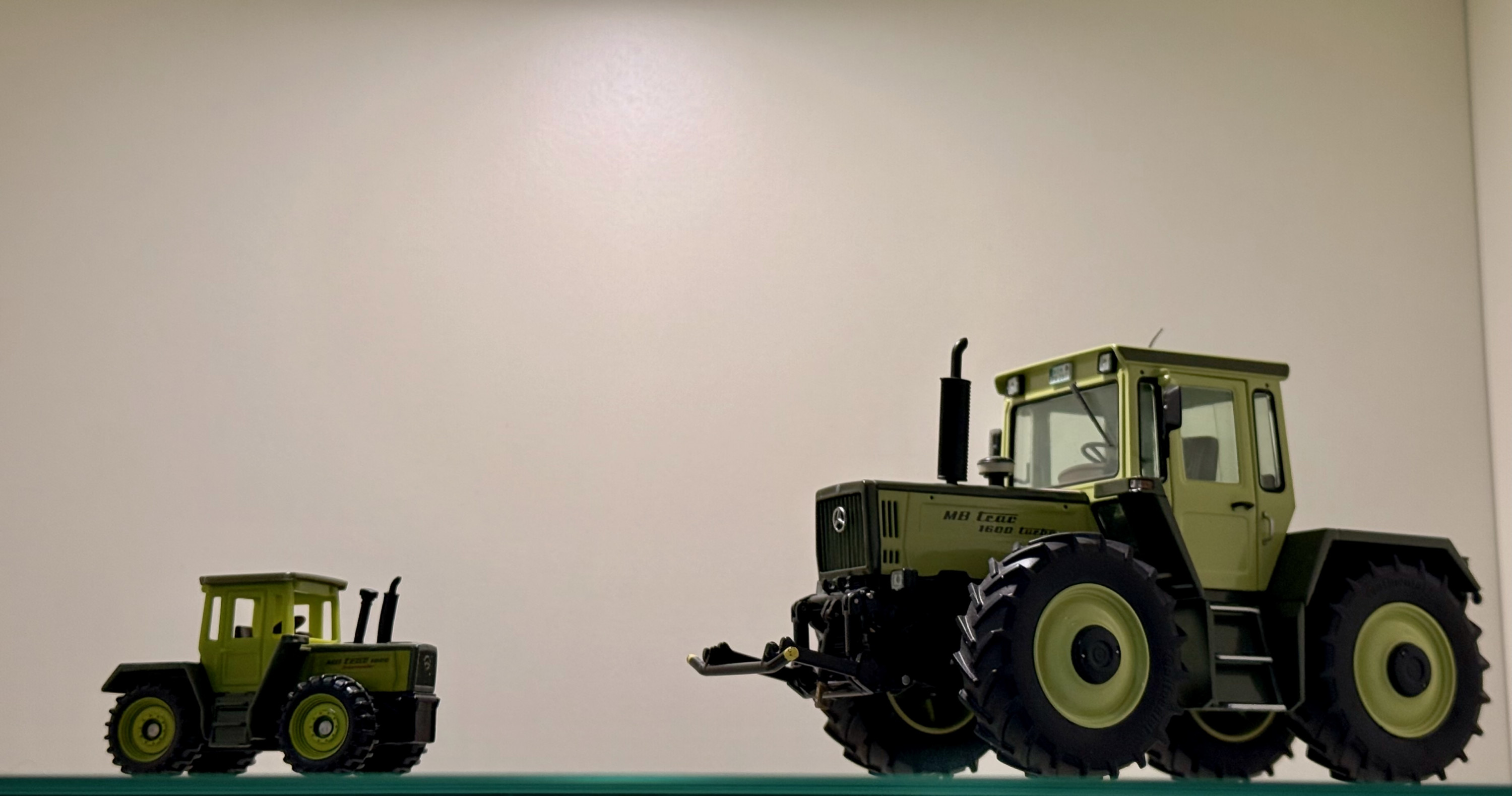 Zu sehen sind hier der Mb Trac 1800 Intercooler von Siku im Maßstab 1:87 und der Mb Trac 1600 von Weise Toys im Maßstab 1:32.
